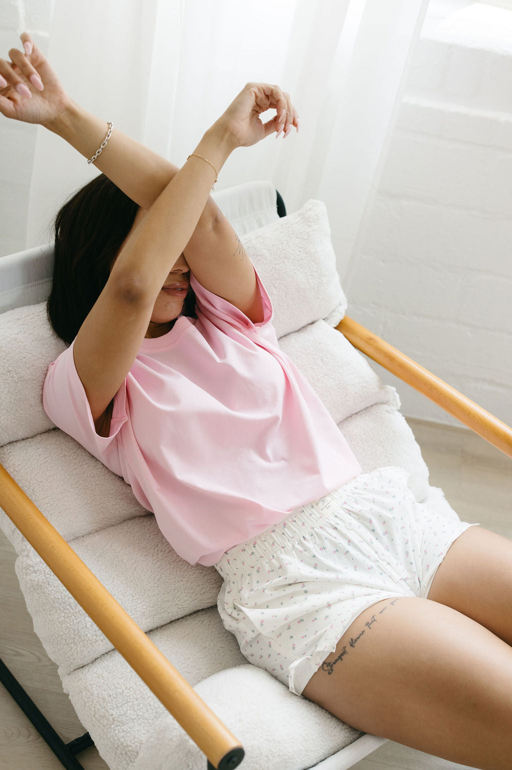 Pastel Pink, Oversized, Cotton, Tee with White and Pink Floral Print Boxers with Elastic Band.