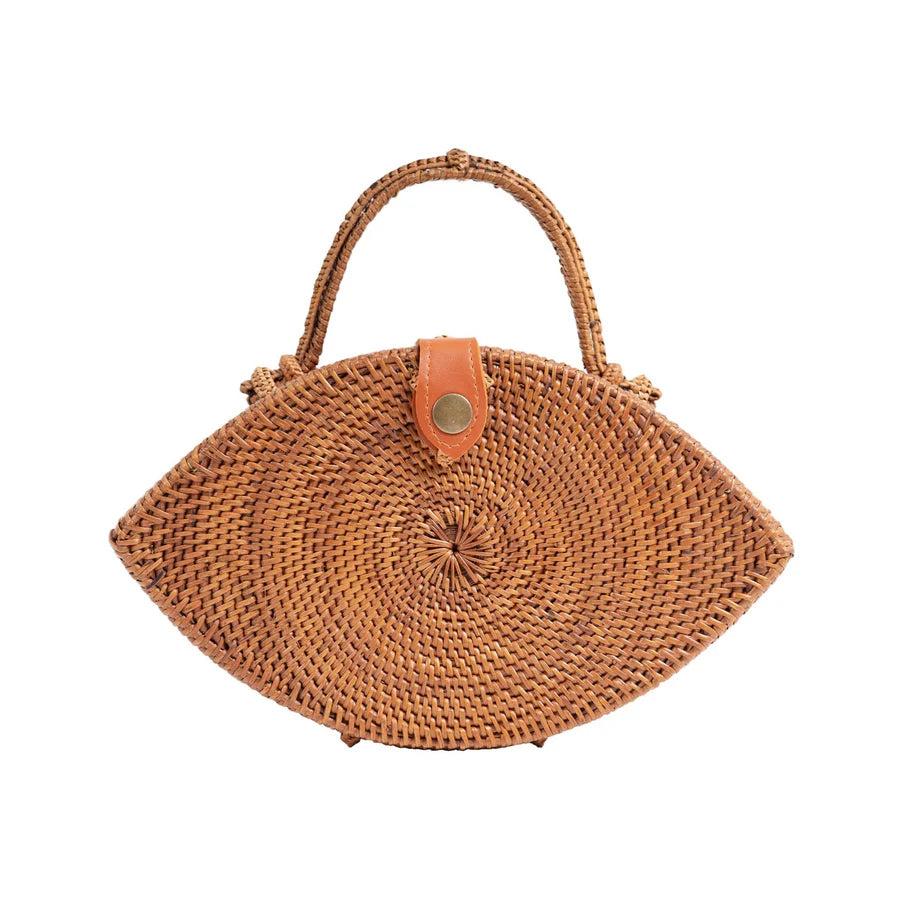 - Crafted From: Natural Rattan with Vegan Leather Snap Closure