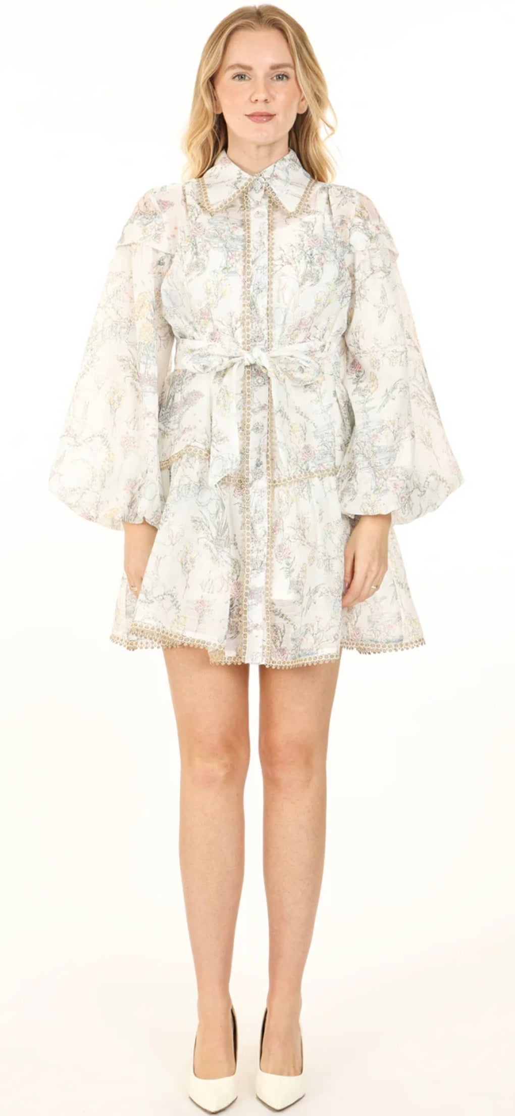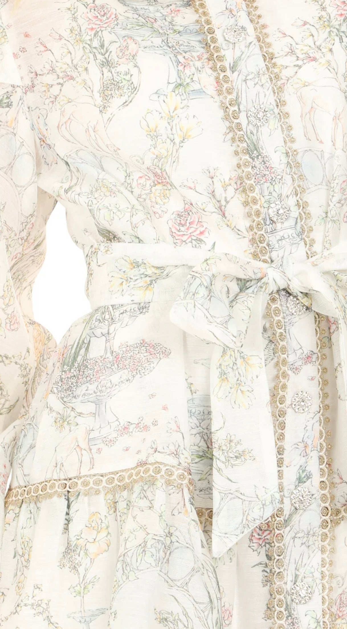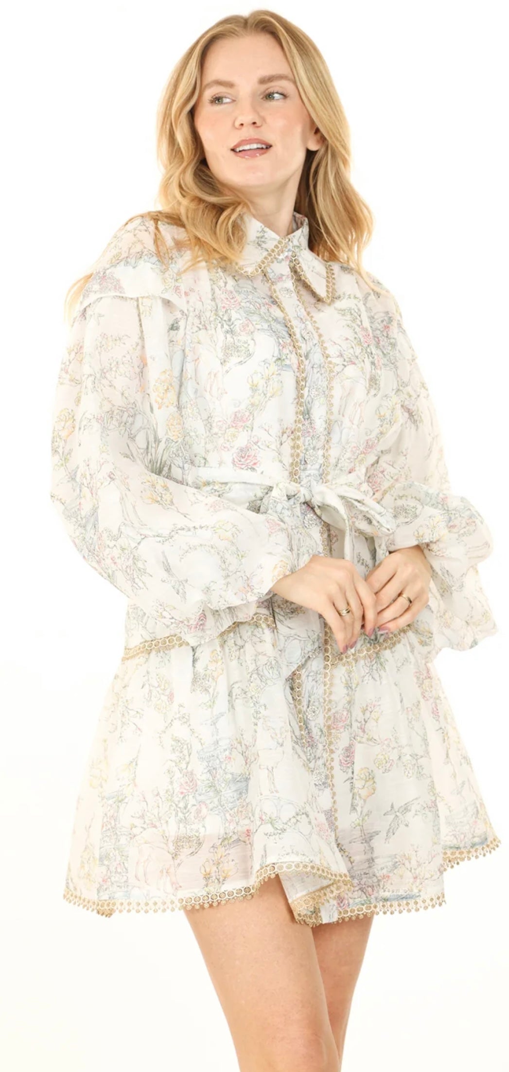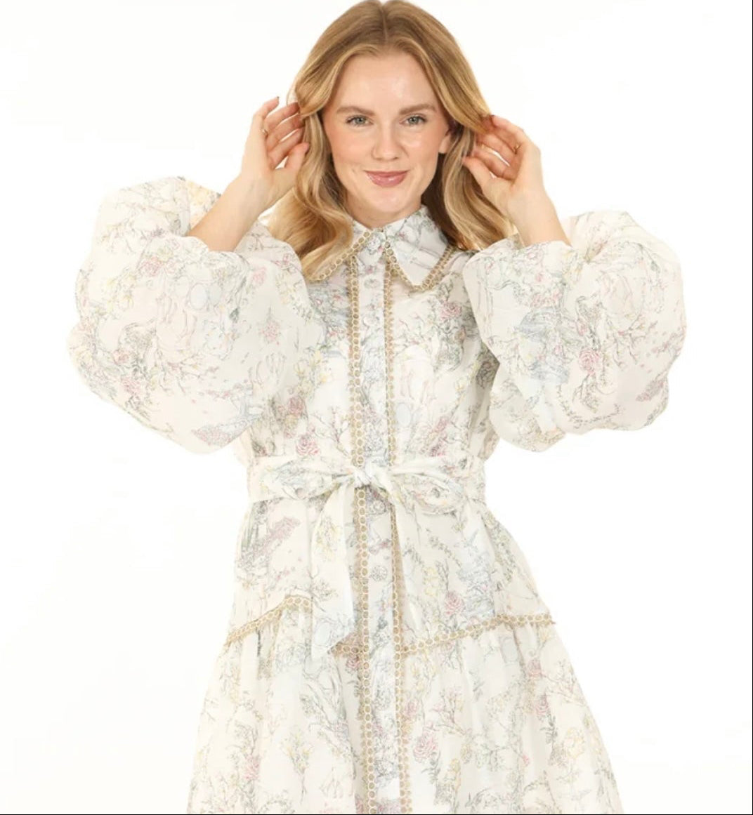 Fairy tale print, with metallic details give this dress an element of whimsy. Style runs true to size and waist belt helps provide more shape.